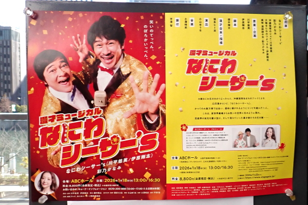| 2026年 1月18日 大阪ABCホールにて漫才ミュージカル「なにわシーザー’S」を鑑賞しました。 出演は川平慈英、伊原剛志、小南満佑子の3人です。 楽天カードマン、ヘパリーゼ、サッカー中継等のネタもあり面白く鑑賞しました。 敬称省略いたしました |