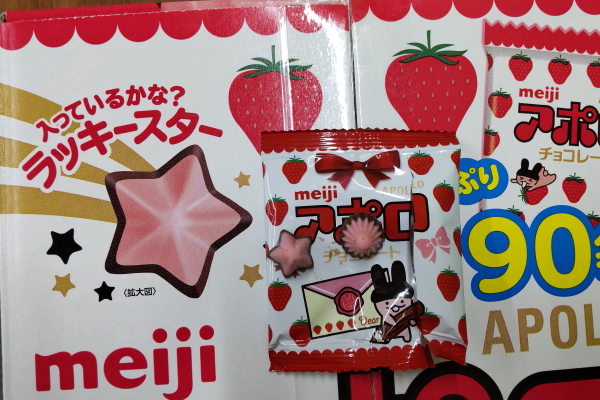 | 2026年 2月17日 会社にてアポロチョコレートを頂きました。 『入っているかな? ラッキースター』 入ってました。袋の上の左側。右はノーマルチョコ。 |