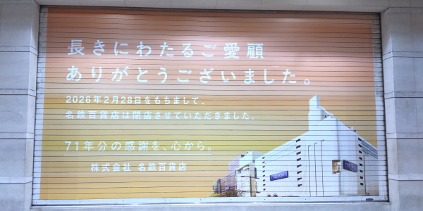| 2026年 3月1日 昨日の2月28日に名鉄百貨店が閉店しました。3月1日に名古屋駅に用事がありその後を見てきました。地上店舗はシャッターが下りており、地下街も名鉄電車改札口より奥はシャッターが下りておりデパ地下も閉店でした。 ナナちゃんは皆さんに感謝を込めてナナちゃんの7に因み毎時7分、17分、27分、37分、47分、57分に7回手を振っていました。 名鉄百貨店の広報部社員でしたが4月から親会社の名古屋鉄道に移籍するそうです。 |